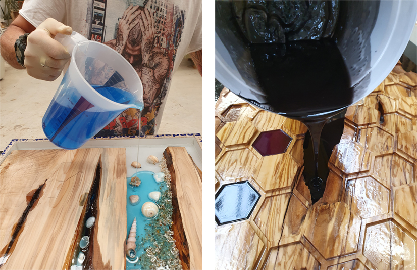 Oltre all’aspetto trasparente tipico dell’acqua è possibile colorare la resina utilizzando dei pigmenti appropriati creando un’infinità di effetti diversi. E’ possibile inoltre inglobare materiali diversi come sabbia, conchiglie, foglie, trucioli, ferro, piccoli oggetti, ecc.. per creare qualcosa di veramente speciale unico che possa rispecchiare i gusti e le passioni dei nostri clienti.